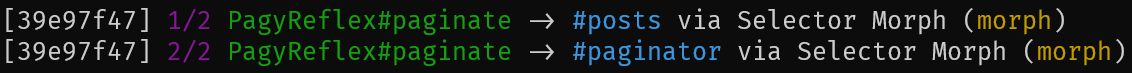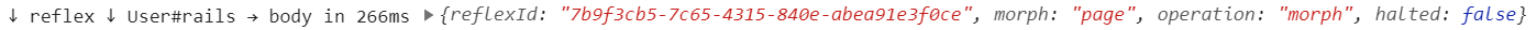 Page Morphs reply with the target (User#rails) as well as the destination for the content and how long the Reflex took to complete, start to finish. Page Morphs run the controller action for the current page, so they tend to be significantly slower than Selector Morphs. CableReady morph operations are always used for Page Morphs.