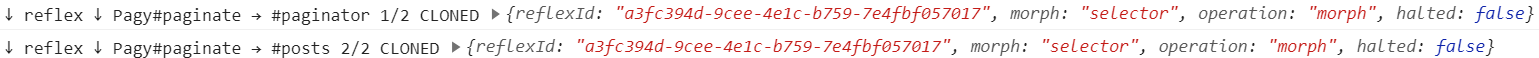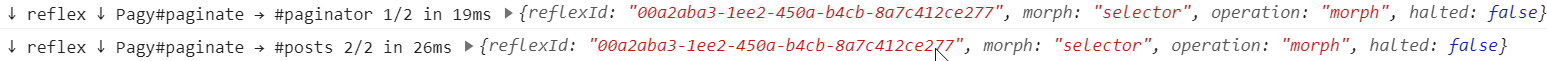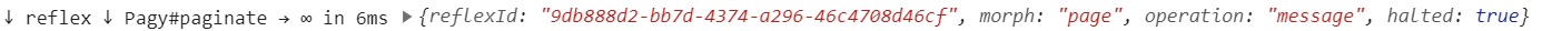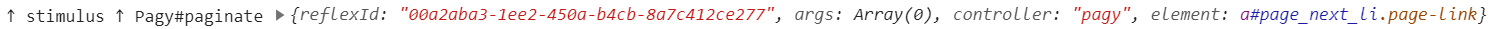The log for the Reflex request (which starts with ↑ stimulus ↑) shows the target Pagy#paginate (name of the Reflex class and the Reflex action being called) as well as an object containing the reflexId, any args (arguments) being passed to stimulate(), the Stimulus controller that invoked the Reflex, and the element that the Stimulus controller instance was placed on.